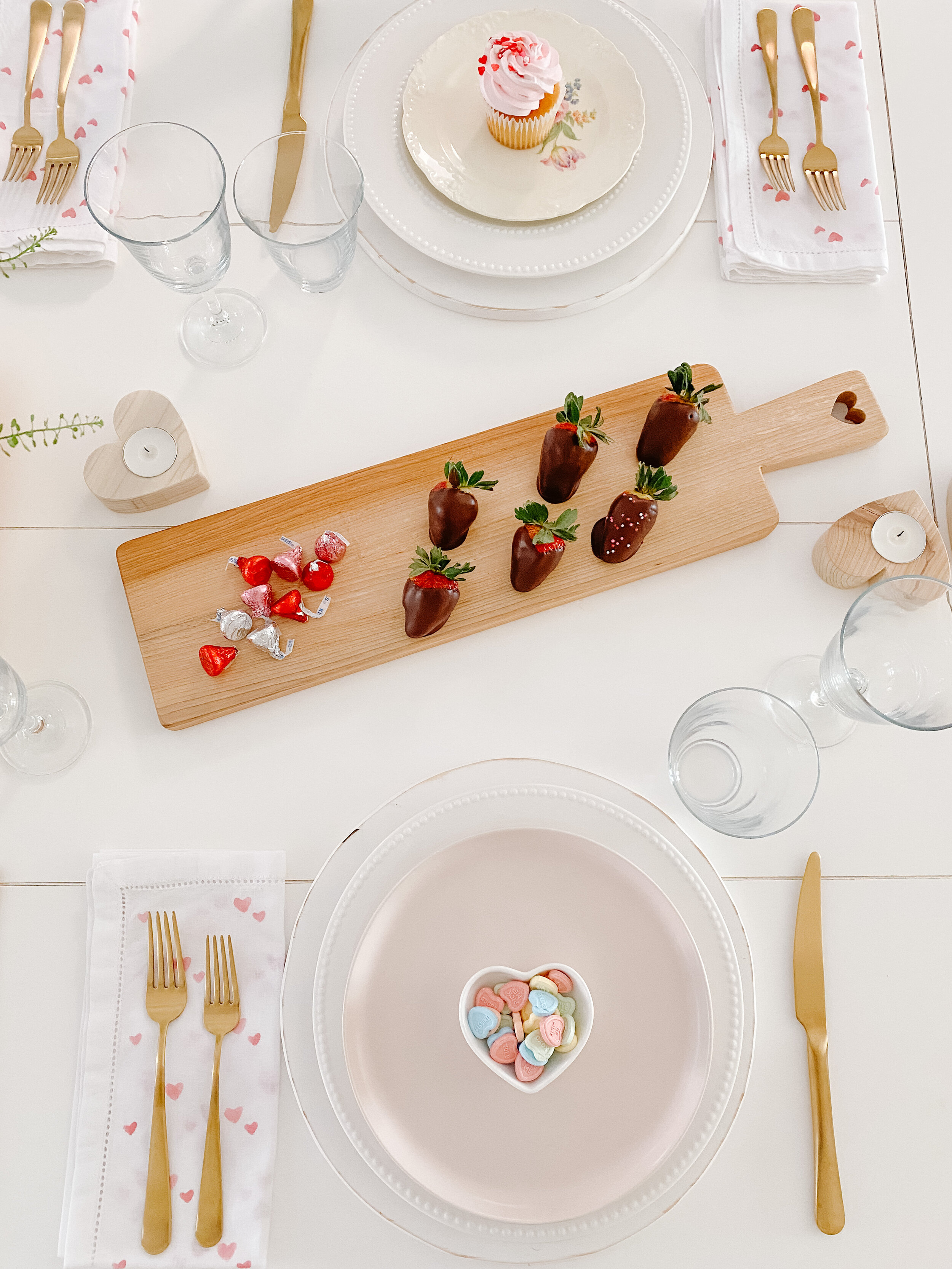I'm always adding reusable cloth napkins to my collection. I have a bin full in the basement and in my serving hutch. I love the way my DIY heart napkins turned out and how perfect they look in this tablescape. I'm in love with my new matte gold cutlery. I think it looks so beautiful on our white table.